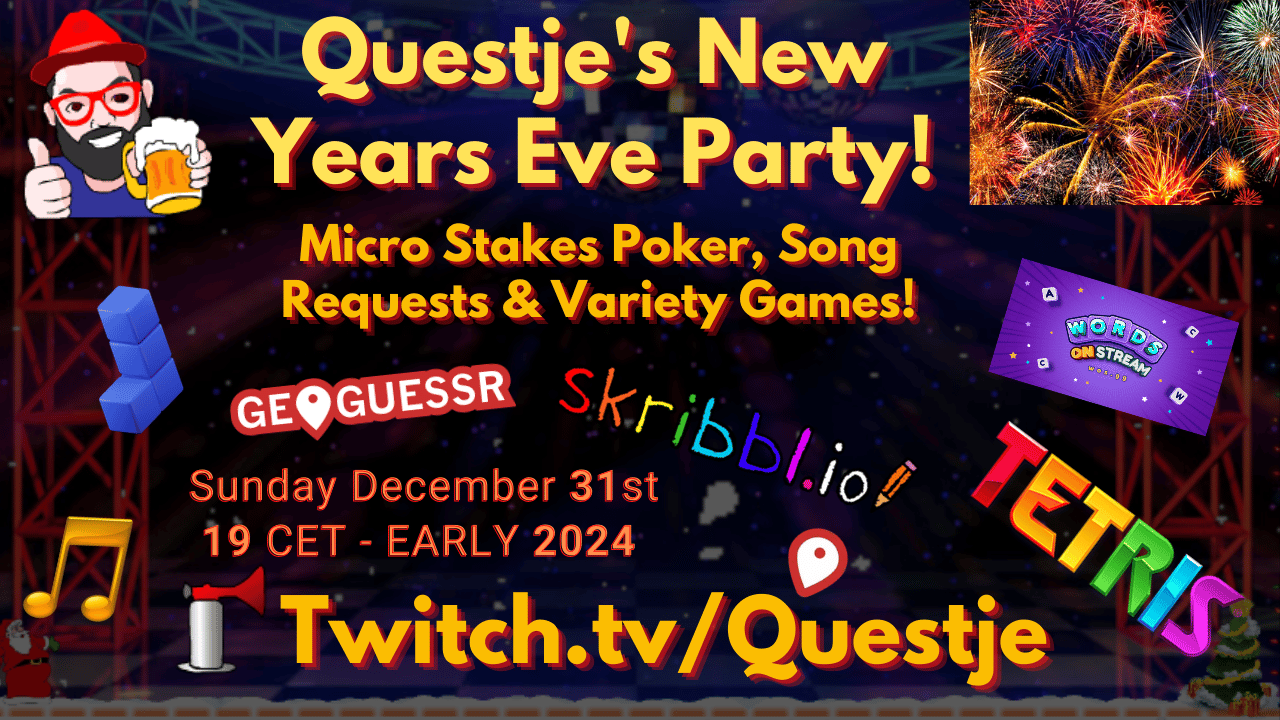 Sunday, Dec 31st I’ll stream another edition of my New Years Eve party! No Delay, Drinks, Games, Music and probably some micro stakes Poker as well. Let’s start 2024 with a blast! 🙂