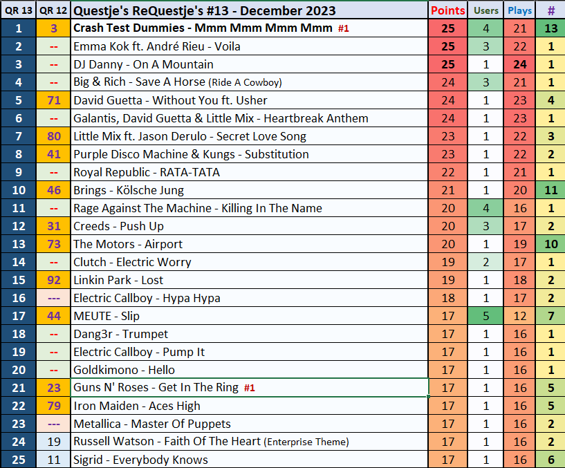 Last Friday, December 8th, I hosted QR #13! Can’t believe I’ve been doing this Event for 3 years now, but I don’t see a reason to stop :-) I love making and preparing the chart and hosting all the great music during the stream. The new #1 of this edition was quite a fun surprise for the top requester TheMortyNL but with a bit of help of LarsK and myself it just beat Emma Kok. But still a great new entry for that beautiful cover of Voilá at #2. See the top 25 below! All current Song Requests count for the next edition that will be hosted in March 2024.